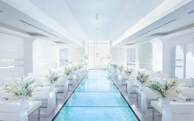扉を開くと目に飛び込んでくるのはガラスのバージンロード。透明にクリアに輝くそこを歩むことができるのは花嫁とそのご家族だけです。純粋無垢な