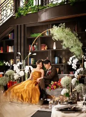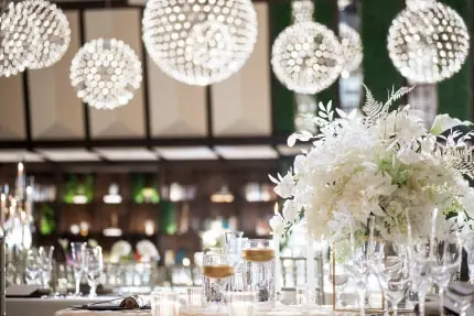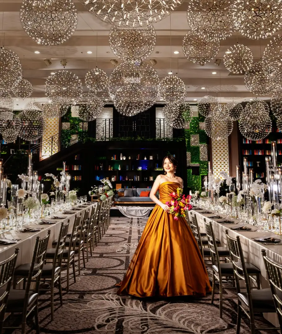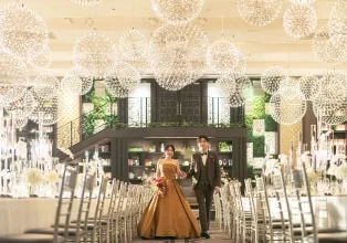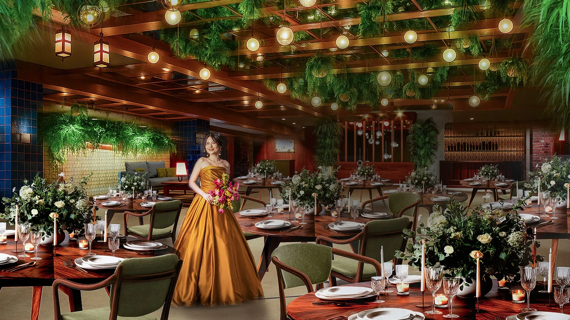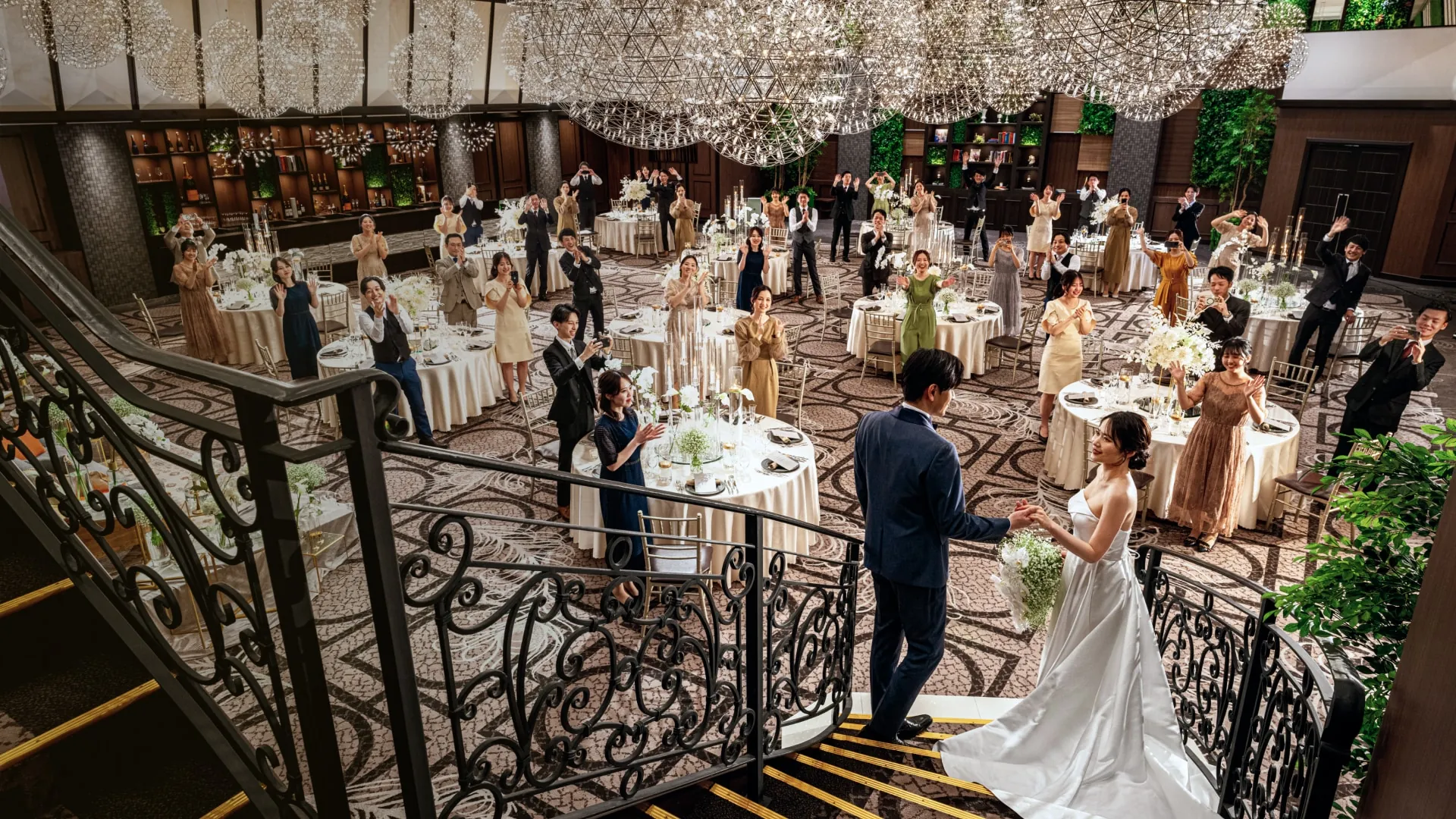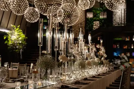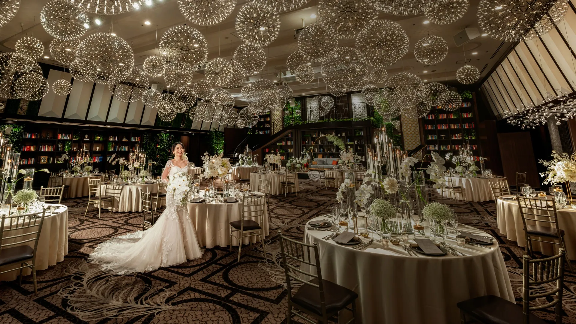 シックなパーティ会場を彩るのは、宇宙に漂う無数の星のようなレイモンド照明。一歩入った瞬間に誰もが心を奪われる美空間は、日常とはまったく異なる世界のよう。ラグジュアリーな時間をお過ごしいただけます。