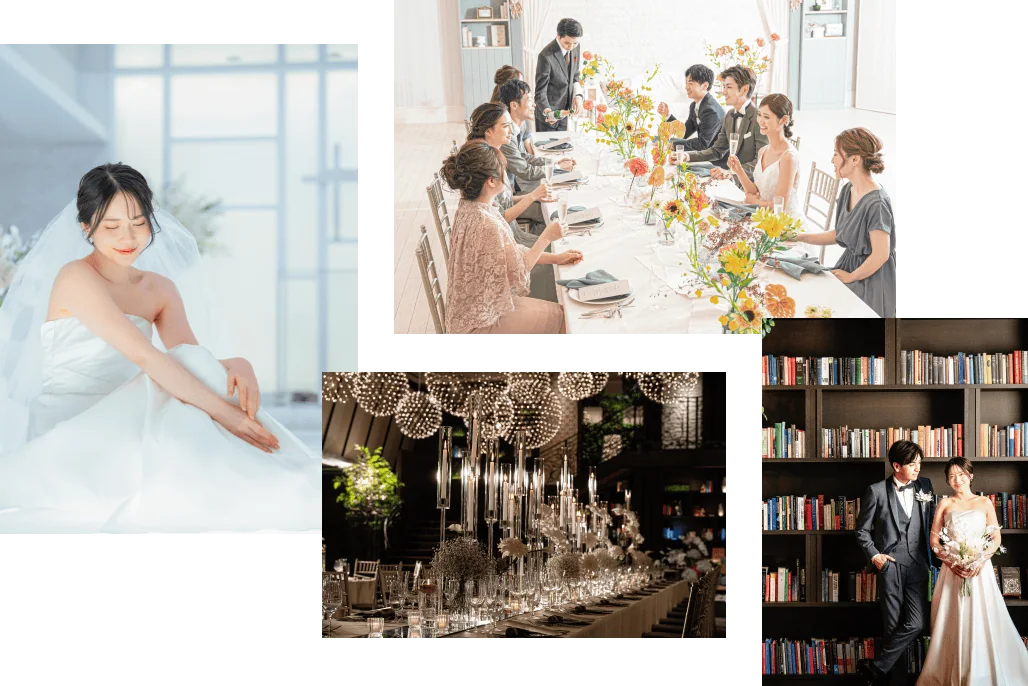 幼い頃からの憧れ、ウエディングドレスを纏う花嫁は幸せに輝くよう。シルクやレース、アクセサリーやブーケに包まれて過ごす時間をお楽しみください。常時300点以上のラインナップで花嫁をお迎えします。